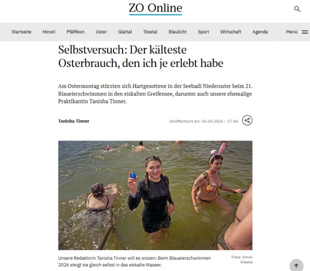 Natürlich ist das Wasser am Ostermontag noch kalt. Etwa 5 bis 13 Grad, aber genau darum geht es. In der Seebadi von Niederuster vom Steg bis zum 20 m entfernten Sprungturm. Dort holt man sich ein blaues Ei. Zurück am Ufer lässt man sich feieren und macht Eiertütschen. Dazu gibt es warme Eiersuppe, Eierpunsch und anderes.
